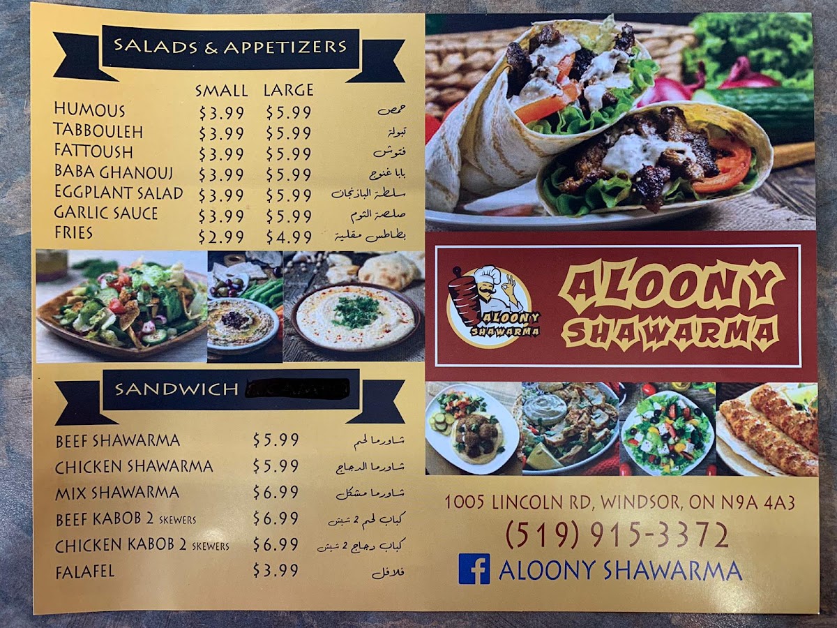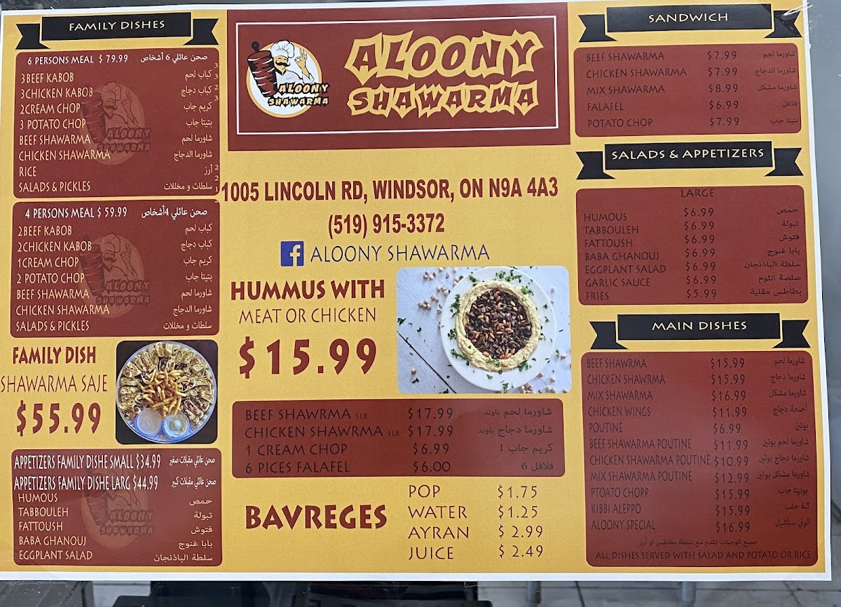 Welcome to Aloony Shawarma, a gem nestled on Lincoln Road in Windsor, ON, where culinary delights meet warm hospitality. The menu is a vibrant celebration of Middle Eastern flavors, highlighting their exquisite shawarma options. You can indulge in a variety of mouthwatering dishes, from the Mix Shawarma On Saj to packed Shawarma Saj Platters. Vegetarian options like Hummus and Baba Ghanoush provide delightful appetizers, ensuring there's something for everyone.